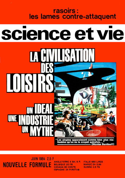 juin 1964 – 180 pages• Éditorial • Correspondance • Il y a 50 ans dans La Science et la Vie Sociologie : Notre enquête : le temps des loisirs Communications : Une industrie nouvelle : les Congrès Physique : • Les techniciens du néant • La dynastie des Ferdinand, robots évolués • On connaît enfin le secret des colles Document : Le photographe et son cobra Pêche : 50 millions de tonnes de poissons Physiologie : Pourquoi une rose sent la rose Biologie : L’arche de Noé du Pacifique Médecine : • Le droit à la santé • Les nouveaux chirurgiens de la cellule vivante Astronautique : • Fiabilité : l’équation de la malchance • L’espace demain : fluor et colloïdes Aviation : • Air Inter sur le chemin des 450 000 passagers • Qui gagnera les 7 millions AF du premier vol humain ? • Pilotage automatique pour la « chaise volante » Archéologie : • L’Histoire commence à Chatal-Huyuk • Fusée temporelle pour l’an 7000 Mieux-vivre : • Rasoirs : les lames contre-attaquent • La chaussure chimique : 100 000 trous au cm2 • Placage d’or par aérosol Banc d’essais : Photo : le Yashica et le Praktisix soumis aux tests La Terre : Le professeur Littleton soulève des montagnes Atome : La particule « oméga-moins » déclenche l’hystérie des savants Chronique : Les livres du mois
