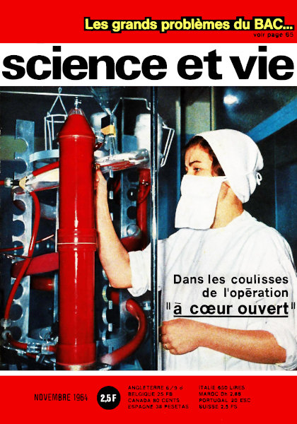 novembre 1964 – 180 pages• Courrier des lecteurs • Il y a 50 ans dans La Science et la Vie • Science-Flash actualités • Cœur ouvert : la technique du miracle • La réforme du bac : « Ne recollons pas les débris du vase de Soissons » • Contre la pollution automobile : la « soufflante américaine » • Des myrtilles pour y voir la nuit • La matrice artificielle • Un bijou de 106 mètres : le Shwe Dagon • Cet avion replie ses ailes en vol ! • Décollage sur un mouchoir, grâce au treuil-turbine • Notre corps contrôlé par des points de couleur • La Lune vue à 300 mètres : on sait enfin ce que signifie l’exploit • Jeux et paradoxes : La démocratie en péril • Le psychodrame : une « Commedia dell’Arte » • Une maison hantée… par des ondes • Sondages d’opinion : comment 3 000 personnes expriment les désirs de tout un peuple • Cousteau : vivre sous l’eau • La mesure de l’infiniment petit • Les baleines vont disparaître • Doping hors-la-loi • Le premier navire atomique européen • Demain, des câbles de un million de volts • Le « dactylo-Xeronic » : 50 lignes à la seconde • Banc d’essai : Après 50 heures d’écoute, les saphirs massacrent les disques • Cinéma : voici le projecteur 8 mm de 1965 • Les livres du mois