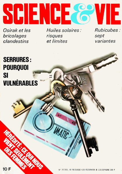 août 1981 – 164 pagesSAVOIR • Osirak : « petites » bombes et grands effets • Doses limites de radioactivité : la querelle s’envenime • La Terre ne tourne pas vraiment rond • Physique : une cinquième force fondamentale ? • Le café est bien une drogue • Trop de gaz carbonique dans l’atmosphère • Clonage : c’est le tour des poissons • Hérédité : ce qui nous vient seulement des femmes • Dyslexie : de petites anomalies cérébrales • La découverte des transposons bouleverse la génétique • Greffes de cerveau : progrès lents mais sûrs • Bronzage : risques et limites des huiles solaires • Chroniques de la recherche POUVOIR • Pas de « béquilles » pour les créateurs d’entreprises • L’homme se met « dans la peau » du robot • On traite déjà les enfants avant leur naissance • Un barrage contre la faim au Sahel • Les vagues surveillées par radar • Pêche : un bateau testé et patronné par Science & Vie • Petits élevages (II) : les écrevisses • Chroniques de l’industrie UTILISER • Serrures : le mot-clé est « finesse » • Photo : repros diapos sans labo • Sept variantes du « Rubicube » • Physique amusante : Comment reproduire les objets par moulage • La calculette de l’astronome : La précession des équinoxes • Jeux et paradoxes : Les premiers toujours en tête • Jeux de réflexion : « Éphémis » au banc d’essai • Jeux stratégiques : « Fortress Europa » : scénarios pour un débarquement • Go : La partie annulée • Électronique amusante : Le « tac-bip » • Les échecs • Les livres du mois • Chroniques de la vie pratique |
