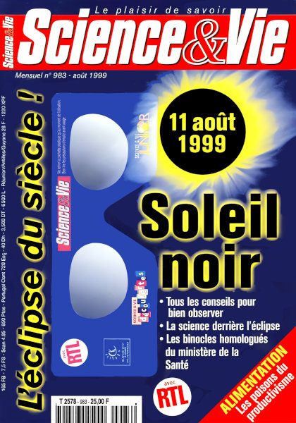 août 1999 – 160 pages• L’évènement : Un espion nommé ADN • Forum ACTUALITÉ • Recherche • Environnement • Technologie • Médecine • EN COUVERTURE : Soleil noir : ce que nous apprennent les éclipses • ÉNERGIE : Detroit s’équipe en supraconducteurs • AÉROLOGIE : Des chercheurs en cerf-volant • MÉDECINE : Confucius met les cancérologues sur la voie • ZOOLOGIE : Sauver les loutres • DOSSIER : L’alimentation est-elle devenue folle ? – Les poisons de la rentabilité – L’agriculteur pieds et poings liés – De l’auge à l’assiette • TRANSPORTS : 2004 : une pile à combustible dans le moteur • ENQUÊTE : Notre patrimoine industriel en danger PL@NET • Actualité du multimédia • Le fournisseur d’accès • L’éclipse au peigne fin sur l’internet • Conso • Le multimédia sur le portable ENCYCLOPÉDIE XXE SIÈCLE • La planète vivante – La Terre est bleue comme une orange – La biosphère et l’homme – ALBERT JACQUARD : « On court à la catastrophe, mais il est encore temps de réagir » LOISIRS • Rétro • Le ciel du mois • CD-Rom • Livres |