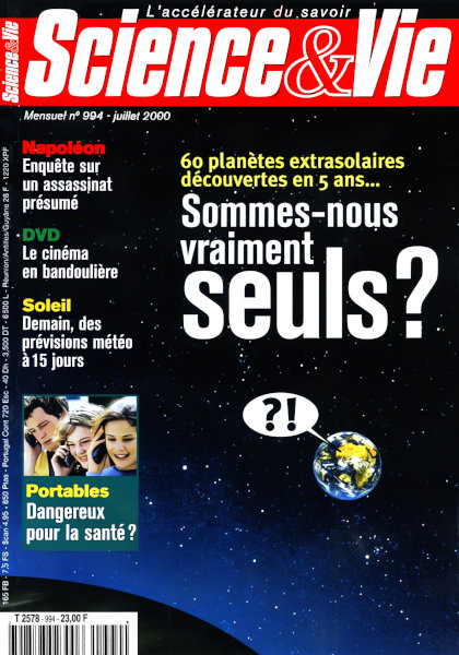 juillet 2000 – 172 pages• L’évènement : La cité des Amazones • Forum ACTUALITÉ • Recherche • Environnement • Technologie • Médecine • EN COUVERTURE : 60 planètes extrasolaires découvertes en cinq ans… Sommes-nous vraiment seuls ? – Des nouveaux mondes par milliards – La vie, ici comme ailleurs ? – À l’écoute des extraterrestres – Focal, le télescope fou • STATISTIQUES : Portables, grosse enquête et petites radiations • ENTOMOLOGIE : Panique sur la ville • CRIMINOLOGIE : Napoléon a-t-il été assassiné ? • DOSSIER : Soleil, avis de tempête • BOTANIQUE : Fleurs de bitume • MÉTÉOROLOGIE : Anatomie d’un orage • INFORMATIQUE : L’ordinateur plus fort que le temps • TECHNOLOGIE : Les matériaux composites à la conquête de l’espace • AUTOMOBILE : La voiture, moyen de communication • HISTOIRE : Georges Lemaître, deux chemins vers la vérité SCIENCE NET • Les dernières nouvelles des réseaux • Exoplanètes sur Toile CONSO • Le cinéma en bandoulière • Téléphonie : la radio contre France Télécom LOISIRS • Rétro • Le ciel du mois • CD-Rom • Livres |