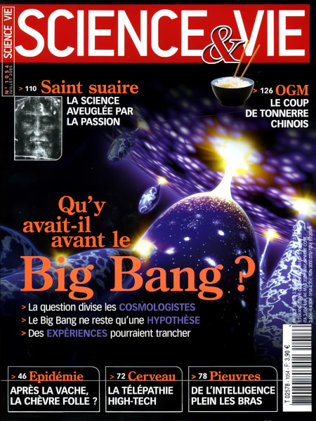 juillet 2005 – 168 pages• Avant-propos : La science et la vie en marche • FORUM : Réactions, critiques, remarques… nos lecteurs prennent la plume • ON EN REPARLE : Nous en avions parlé, ils font de nouveau l’actualité • ILS L’ONT FAIT : Retour en image sur les derniers événements scientifiques ACTUALITÉS • EN DIRECT DES LABOS : Paris est le centre du trafic aérien mondial – Titan livre son premier panorama… • PLANÈTE TERRE : La carte des sites les plus dangereux – Comment les fourmis ont envahi la Terre… • SANTÉ : Le ballonnet radioactif suscite l’espoir – L’hémochromatose dépistée en masse… • L’AGENDA DES SCIENCES : Les grands rendez-vous du mois de juillet • LES CLÉS POUR COMPRENDRE : Après la vache, la chèvre folle ? À LA UNE : Qu’y avait-il avant le big bang ? FONDAMENTAL • TÉLÉPATHIE : C’est parti pour la télépathie high-tech ! • PIEUVRE : L’intelligence plein les bras ! • POINTILLISME : Les mathématiques sont enfin au point • DEEP IMPACT : La sonde suicide à l’assaut d’une comète • OCÉANS ACIDES : La nouvelle menace • MÉDICAMENTS : Vers le sur mesure selon nos gènes EXPLORATIONS • Saint suaire : la science aveuglée par la passion • OGM : le coup de tonnerre chinois EN PRATIQUE • À LIRE, À VOIR : Tout sur les livres, expositions, films, sites web, etc., de l’actualité des sciences – Et toujours « le Ciel du mois » • Q & R : Dépister le cannabis dans la salive est-il fiable ? – Comment les plantes se tournent-elles vers le soleil ? – Que se passe-t-il vraiment au cours d’une hydrocution ?… • LE POINT SUR… le kytesurf • TECHNOFOLIES : La voiture anti-embouteillage – le blouson à airbag… • TEST : Êtes-vous plutôt chiffres ou lettres ? |