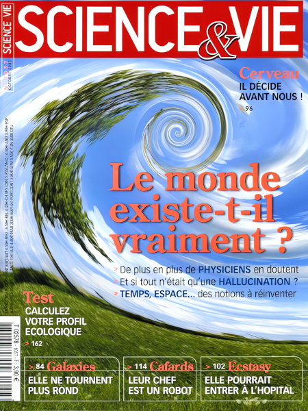 octobre 2005 – 168 pages• Avant-propos : Réinventer le monde ? • FORUM : Réactions, critiques, remarques… nos lecteurs prennent la plume • ON EN REPARLE : Nous en avions parlé, ils font de nouveau l’actualité • ILS L’ONT FAIT : Retour en image sur les derniers événements scientifiques ACTUALITÉS • EN DIRECT DES LABOS : On en sait plus sur le régime des hominidés – Le bleuet doit sa couleur à ses ions – etc. • PLANÈTE TERRE : Une île de chaleur artificielle va faire pleuvoir en plein désert – Planter des arbres peut aggraver la sécheresse – etc. • SANTÉ : L’homéopathie est bien un mythe – On a moins mal si c’est par surprise – etc. • L’AGENDA DES SCIENCES : Tous les grands rendez-vous scientifiques de septembre • LES CLÉS POUR COMPRENDRE : Que doit-on faire des déchets nucléaires ? À LA UNE : Le monde existe-t-il vraiment ? FONDAMENTAL • GALAXIES : Leur classification est remise en question • MICRO-ARN : Ils ouvrent une voie inédite contre le cancer et les virus • LIBRE ARBITRE : Notre cerveau décide souvent avant nous • ECSTASY : Des psychiatres exploitent ses vertus anxiolytiques • LOI DE MOORE : Elle bute désormais sur les lois de la physique • CAFARDS : Un robot les imite et devient leur leader EXPLORATIONS • RÉCIT : Rendez-vous céleste en Atacama • RENCONTRE : « J’ai résolu le paradoxe de l’œuf » EN PRATIQUE • À LIRE, À VOIR : Tout sur les livres, expositions, films, sites web, etc., de l’actualité des sciences. – Et toujours « le Ciel du mois » • Q & R : Les oméga 3 sont-ils bons pour la santé ? – Que deviennent les photons quand on éteint la lumière ? – Pourquoi le fer à repasser défroisse-t-il le linge ? – Pourquoi l’eau éteint le feu ? • LE POINT SUR… le son surround • TECHNOFOLIES : La montre en papier électronique – Le parapluie sans pépins… • TEST : Quel est votre profil écologique ? |