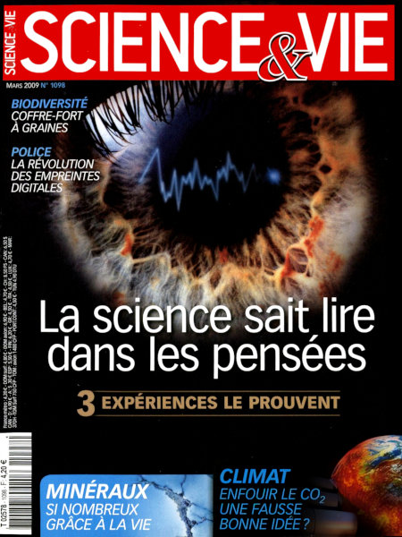mars 2009 – 144 pages• Avant-propos : À voir, dans les pensées… • FORUM : Réactions, critiques, remarques… nos lecteurs prennent la plume • ILS L’ONT FAIT : Retour en image sur les derniers événements scientifiques ACTUALITÉS • EN DIRECT DES LABOS : Pour rajeunir, des étoiles se font ogresses – La fourmi usurpatrice est trahie par son odeur – Le moustique amoureux vibre à 1 200 Hz – etc. • L’EXPLOIT : L’holographie de proximité est née • PLANÈTE TERRE : • ENVIRONNEMENT : Le mystère de la Chaussée des géants a été élucidé – L’homme accélère l’évolution des espèces – etc. • SANTÉ : L’hydre révèle un pouvoir antibiotique insoupçonné – On sait comment l’acarien déclenche l’allergie – etc. • TECHNOS : Des sacs d’eau vont mieux cibler les feux de forêts – etc. À LA UNE : Décodeur cérébral VIE D’AUJOURD’HUI • BIODIVERSITÉ : En plein cœur du Spitzberg, un étonnant sanctuaire conserve une copie de sauvegarde de toutes les graines de la planète • EFFET DE SERRE : Stocker le CO2 sous terre ne semble plus être une solution miraculeuse au réchauffement • POLLUTION LUMINEUSE : L’éclairage nocturne bouleverse les écosystèmes et constitue un énorme gaspillage énergétique • POLICE SCIENTIFIQUE : Des techniques hypersophistiquées améliorent la récolte des empreintes digitales FONDAMENTAL • SYLPHES ROUGES : Presque la fin du mystère • ADN : C’est une enzyme qui recolle ses brins • MINÉRAUX : Sans la vie, il n’en existerait pas autant • LIMACE DE MER : Un cas unique d’animal doué de photosynthèse EN PRATIQUE • Q & R : Comment calcule-t-on l’heure de décès d’une victime ? – Pourquoi cracher dans le masque avant la plongée ? – Que devient le virus de la grippe en été ? – etc. • LE POINT SUR… la souris d’ordinateur • TECHNOFOLIES : Une voiture aux allures d’ovni pour gagner en performances – Le baladeur champion d’autonomie – La planche qui veut révolutionner la glisse – etc. • À LIRE / À VOIR / .NET : Tout sur les livres, expositions, films, sites web, etc., de l’actualité des sciences. Et toujours « le Ciel du mois » • NOS 3 QUESTIONS À… Hervé Le Bras |