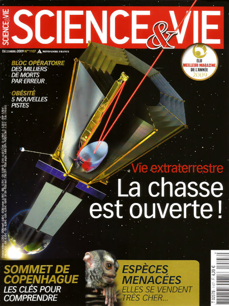 décembre 2009 – 152 pages• Avant-propos : La conquête d’un rêve • FORUM : Réactions, critiques, remarques… nos lecteurs prennent la plume • ILS L’ONT FAIT : Retour en image sur les derniers événements scientifiques ACTUALITÉS • EN DIRECT DES LABOS : Par deux fois, l’homme a perdu sa diversité génétique – Les singes craignent leurs avatars virtuels – À la surface, on entend les entrailles de la Terre – etc. • L’EXPLOIT : Le plus suissant spectromètre au monde est prêt • PLANÈTE TERRE : • ENVIRONNEMENT : Un carburant synthétique a été testé sur vol régulier – En Inde, l’eau d’irrigation ferait grimper le niveau des océans – etc. • SANTÉ : La rétine sera enfin perméable aux médicaments – La dyslexie varie selon la langue – etc. • TECHNOS : Un capteur photo est hypersensible – Le premier monocycle électrique a été dévoilé – etc. À LA UNE : Vie extraterrestre : la chasse est ouverte ! VIE D’AUJOURD’HUI • SOMMET DE COPENHAGUE : Quels sont les enjeux autour desquels devront s’entendre les délégations pour lutter contre le réchauffement ? • BIODIVERSITÉ : Dès qu’une espèce est classée « en danger », elle se retrouve paradoxalement encore plus menacée car sa rareté attire les convoitises • RISQUES MÉDICAUX : Check-lists : quand l’aéronautique inspire l’hôpital… FONDAMENTAL • NOMBRES PREMIERS : Ils se cachent dans la matière ! • Cinq nouvelles armes contre l’obésité • GRILLON : La femelle sait trier le sperme de ses amants • ÉVOLUTION : Elle sait aussi inventer de nouveaux gènes EN PRATIQUE • Q & R : Quel est le moyen de transport le plus sûr ? – Avec les nouvelles ampoules, faut-il plus chauffer chez soi ? – Pourquoi l’alcool désinhibe-t-il ? – etc. • LE POINT SUR… la pilule du surlendemain • TECHNOFOLIES : L’écran plat sans bords – Le GPS capable de localiser les amis – Le premier livre de réalité augmentée – etc. • À LIRE / À VOIR / .NET : Une sélection spéciale beaux livres, tout sur les expositions, films, sites web, etc., de l’actualité des sciences. Et toujours « le Ciel du mois » • NOS 3 QUESTIONS À… Evelyne Heyer |