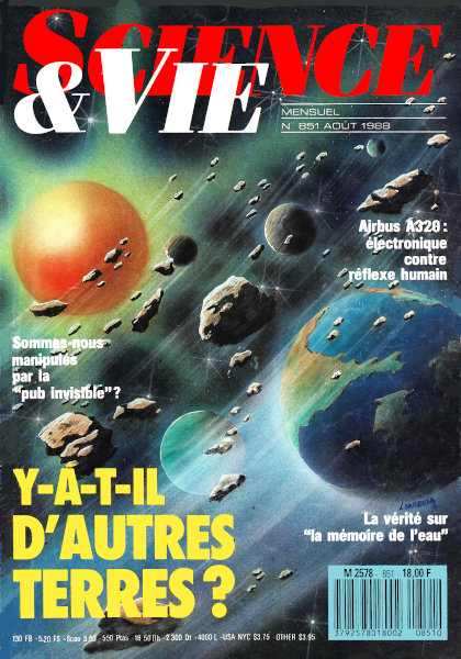 août 1988 – 160 pagesSAVOIR • Forum • La vérité sur la mémoire de l’eau • Sommes-nous manipulés par la « pub » invisible ? • Darwin III : la première machine à penser • La pilule anti-stress • Géographie : chacun voit midi à sa carte • Voici le 80 milliardième humain depuis Adam • Y a-t-il d’autres Terres dans le ciel ? • C’est parti pour la conquête de Mars • Les étoiles de Bretagne • Respirer de l’eau • La guerre des coraux • Pollution : les peintures anti… huîtres • Myxomatose : saluons le Dr puce • Échos de la recherche POUVOIR • USA : vicissitudes d’un bombardier stratégique • Airbus : réflexe humain contre réflexe électronique • Le plus petit jet du monde • Quand les ordinateurs lisent vos lettres • Vidéo aux péages routiers • Échos de l’industrie UTILISER • Ne manquez pas Mars • La photo en couleurs, mémoire millénaire ? • Physique amusante : Chambre claire • Informatique amusante : Virages et loopings • Le journal de l’astronome : Les Perséides • Électronique amusante : Un enregistreur de pages Minitel • Jeux mathématiques : Des couronnes pour les champions 88 • Les livres du mois • Échos de la vie pratique • Les objets du mois |