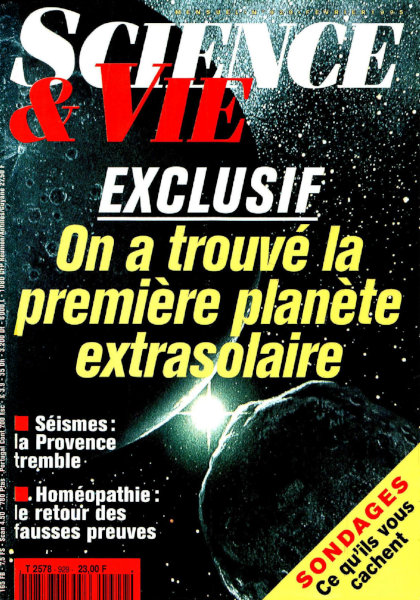 février 1995 – 172 pages• L’évènement : Satellites, les nouveaux anges gardiens • Recherche • Environnement • DÉCHIFFRAGE : Quelles langues parle-t-on en France ? • SÉISMES : Le réveil de la Provence • EXCLUSIF : On a trouvé la première planète extrasolaire • SUPER-CANON : De la Terre à la Lune • EXPLOITS : La vie s’accroche partout • OBÉSITÉ : Le poids de l’hérédité • HOMÉOPATHIE : Le retour des fausses preuves • CAUCASE : La forteresse imprenable • ENDURANCE : Quand l’homme dépasse ses limites • Technologie • JAPON : La lévitation magnétique s’envole • COMBAT AÉRIEN : L’avion qui se joue de la pesanteur • INFORMATIQUE : Dictez, l’ordinateur écrit • ENQUÊTE : Ce que les sondages nous cachent • CD-I : L’interactivité pour tous • Quotidien • Médiathèque • Agenda • Comment ça marche : Liaison infrarouge • Électronique amusante : Recevons des images • Informatique amusante : Fractions • Biologie amusante : Modéliser les molécules • Le journal de l’astronome : Lunettes astronomiques en 1995 • Échecs & maths : Le roque cimetière & Le Digit et le Serpent • Forum • 3615 SCV • Index des numéros 916 à 927 pour l’année 1994 • Science & Vie il y a… |