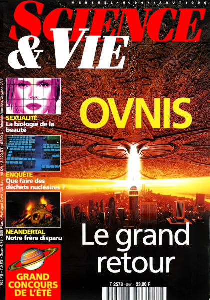août 1996 – 164 pages• L’évènement : Le raid des cybergangs ACTUALITÉ • Recherche • Environnement • Technologie • Médecine • BALISE : Les voyageurs de la science • FOCUS : Peut-on se passer de viande ? • OPTIQUE : Rayon vert : rendez-vous avec un fantôme • GÉNÉTIQUE : Les Basques avant tout le monde • PALÉONTOLOGIE : Néandertal, le deuxième homme • PSYCHOLOGIE : Belle comme une énigme • EN COUVERTURE : Ovnis, le grand retour – L’odyssée des petits hommes verts – Les magiciens de l’Univers – Et s’ils étaient déjà là ? • CAHIER PHOTOS : Randonnées sous-marines • JEU : Grand concours de l’été • OCÉANOGRAPHIE : La bataille du corail • TOXICOMANIE : La mort au bout de l’extase • ENQUÊTES : Déchets nucléaires, le casse-tête • HISTOIRES : Neptune, la guerre des pères • DÉFENSE : Une arme contre les avions furtifs : la télé • COMMUNICATION : Télé : les « bouquets » ont des épines RENDEZ-VOUS • Quotidien : Cinéma en 3D : au cœur de l’action • Astronomie : Lumière zodiacale • L’expérience : Qu’est-ce que l’effet Doppler ? • Échecs : Il faut savoir sacrifier la qualité • Rétro : Il y a 40 ans • Forum : Abus de médicaments : tous coupables • Médiathèque : Du sang et des larmes • Internet : Retour à l’état de nature FUTURS • L’homme doit-il abandonner l’espace ? • Les dragons asiatiques veulent dévorer le monde • C’est déjà demain ! |