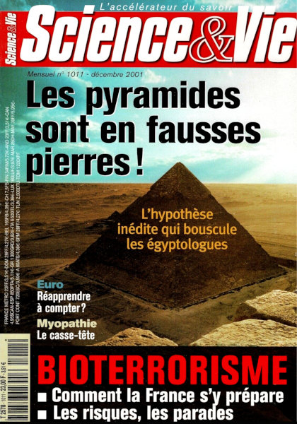 décembre 2001 – 184 pages• L’évènement : La menace biologique • Forum ACTUALITÉ • Recherche • Environnement • Technologie • Médecine • EN COUVERTURE : Pyramides : l’hypothèse des fausses pierres ! – Les laboratoires mènent l’enquête – Les secrets bien gardés des bâtisseurs de pyramides • PHYSIQUE : Les gouttes d’eau ne sont plus ce qu’elles étaient • ENQUÊTE : A-t-on retrouvé l’onde qui soigne le cancer ? • PHYSIQUE : L’inconstance universelle • DOSSIER : Les arcanes de l’euro • MÉDECINE : Trisomie 21 : dépister sans amniocentèse • ÉCOLOGIE : L’Australie rongée par le sel • GÉNÉTIQUE : Un gène au secours de la myopathie • FOCUS : Le bioterrorisme en questions – 1 – L’arme idéale ? – 2 – L’arsenal biologique – 3 – Comment la France se prépare ? – 4 – Que peut la recherche ? • ASTRONAUTIQUE : Un robot dans l’espace • PRÉHISTOIRE : Il y a 15 000 ans… les premiers portraits SCIENCE NET • Le grand aquarium universel INTERNET • Les architectes du vent CONSO • Tentations électroniques LOISIRS • Le ciel du mois • CD-Rom • Livres • HISTOIRE : Marconi, l’homme de la TSF • RÉTRO : Il y a 70 ans |