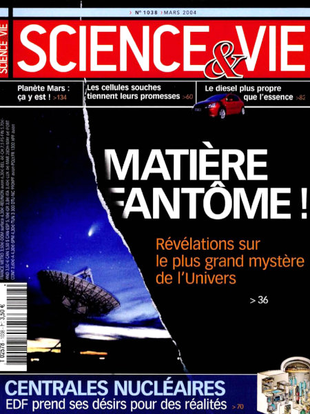 mars 2004 – 156 pages• Avant-propos : L’envers du décor ACTUALITÉS • RECHERCHE : • Le calcium aiderait les cellules à s’orienter • L’enseignement supérieur en France est trop cloisonné • Un gène serait à l’origine de la taille de notre cerveau… • SANTÉ & MÉDECINE : • Contre la surdité, des électrodes cérébrales • « Affaires des saumons » : la France récuse les États-Unis… • ENVIRONNEMENT & CADRE DE VIE : • Le tour du monde en avion en 80 heures et sans escale • Désormais. les Français seront recensés par sondages… DÉCODAGE • [À LA UNE] : La matière noire • EN PROGRÈS • Les cellules souches embryonnaires vont tenir leurs promesses • Cube magique : la perfection mathématique a été atteinte ! • EN PRATIQUE • Nucléaire : quand EDF prend ses désirs pour des réalités • Essence versus diesel : le plus polluant n’est pas celui qu’on croit • CASSE-TÊTE • Langues indo-européennes : mais quelle est donc leur origine ? • L’étrange disparition des vautours en Inde REPÈRES • Le point sur… La mesure du temps – Contexte : Jusqu’à quelle précision aujourd’hui ? – Histoire : Une quête aussi vieille que l’Humanité – Outil : Le défi du temps universel – Applications : Une source de progrès tous azimuts – Recherche : Repousser les limites de la précision – Théorie : Une notion de plus en plus difficile à cerner • QUESTIONS-RÉPONSES • Qu’est-ce qui distingue un virus d’une bactérie ? • Pourquoi les animaux hibernent-ils ? • Le ciel du mois • COMMENT ÇA MARCHE : La lampe halogène • ILS L’ONT FAIT • Le mini-robot espion des mers • Le microscope qui peut filmer • Le pneu de vélo indégonflable – Une montre à mémoire flash… • IL Y A… 30 ans EXPLORATION • Mars : objectif atteint ! |