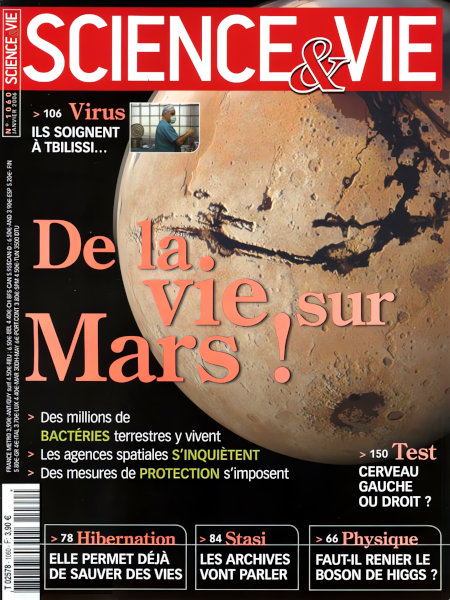 janvier 2006 – 156 pages• Avant-propos : La vie, ça va, ça vient • FORUM : Réactions, critiques, remarques… nos lecteurs prennent la plume • ILS L’ONT FAIT : Retour en image sur les derniers événements scientifiques ACTUALITÉS • EN DIRECT DES LABOS : Les dinos seraient les ancêtres des oiseaux – Un atome lié à son contraire – Le papillon, bijou de technologie – etc. • PLANÈTE TERRE : L’éradication de la faim progresse trop lentement – L’atmosphère n’a jamais été aussi chargée en CO2 – etc. • SANTÉ : Une bactérie ultrarésistante menace l’hôpital – Le déca est mauvais pour le cœur – etc. • L’AGENDA DES SCIENCES : Tous les grands rendez-vous scientifiques de janvier • LES CLÉS POUR COMPRENDRE : Le plan « Psychiatrie et santé mentale » sera-t-il le remède à la crise profonde du traitement des troubles mentaux en France ? À LA UNE : De la vie sur Mars ! FONDAMENTAL • BOSON DE HIGGS : Des physiciens osent douter de son existence… • PLUTON : Pour la première fois, une sonde va lui rendre visite • HIBERNATION : Elle évite les séquelles chez les victimes d’infarctus • STASI : Un logiciel va restaurer ses archives, détruites en 1989 • MICRONAGEUR : Un robot de 20 micromètres nage tel un spermatozoïde ! • OLMÈQUES : Ce peuple précolombien défie encore les archéologues • V-22 OSPREY : Cet avion-hélico va équiper les Marines. Et pourtant… EXPLORATIONS • REPORTAGE : la filière géorgienne des virus qui soignent • RENCONTRE : Donald Olson, profession : enquêteur céleste EN PRATIQUE • À LIRE, À VOIR : Tout sur les livres, expositions, films, sites web, etc., de l’actualité des sciences – Et toujours « le Ciel du mois » • Q & R : Quelle est l’action d’un spy-ware sur un ordinateur ? – Comment se forment les trous noirs ? – Pour quelle raison les félins ronronnent-ils ?… • LE POINT SUR… les remontées mécaniques • TECHNOFOLIES : Une machine à coudre pour broder dessins et photos – L’auto axée vers le futur – etc. • TEST : votre cerveau est-il de droite ou de gauche ? |