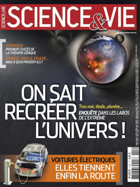 janvier 2013 – 140 pages• Avant-propos : La psyché de l’huître, trou noir de la connaissance • FORUM ACTUS • Labos : Ce sont bien des cellules de tyrannosaure – Titan serait née de chocs entre plusieurs lunes – En gelant, la goutte d’eau devient pointue – Sa pelote garde le bousier au frais – etc. • IDÉE NEUVE : « J’aimerais faire entendre la musique de la science » • Terre : Catastrophes naturelles : le classement des pays à risque a été établi – À Fukushima, la pêche reste radioactive – etc. • Médecine : Alzheimer serait bien favorisé par l’excès de sucre – La puberté précoce pourrait aussi affecter les garçons – etc. • ON EN REPARLE : Paludisme : le vaccin s’avère décevant • ON TENAIT À VOUS LE DIRE : Allô, la science ? Ici la justice… • Technos : Une résine permet de filtrer l’eau comme jamais – Vers un implant qui se charge sur l’oreille interne – Le photovoltaïsme s’inspire des fleurs – etc. • FOCUS : Nanomatériaux : les voici à base d’atomes géants FONDAMENTAL • À LA UNE : On sait recréer l’Univers ! • EXPLOIT : Parkinson : le retour gagnant de la thérapie génique • ANALYSE : Stockage du CO2 : la menace de l’abandon • ENQUÊTE : À quoi pensent les invertébrés ? • REPORTAGE : Volcans : percés à jour par les rayons cosmiques • ÉVÈNEMENT : Voiture électrique : voici la deuxième génération ! • LE POINT SUR… 30 ans après ses débuts… Où va Internet ? EN PRATIQUE • BON À SAVOIR • ZOOM DU MOIS : Votre santé au travail : sept pièges simples à éviter • QUESTIONS / RÉPONSES : Faut-il se méfier des boissons énergisantes ? – Pourquoi seules les ondes radio passent les murs ? – Que voit-on avec une acuité visuelle supérieure à 10 ? – Les animaux sont-ils sensibles à l’effet placebo ? – Pourrait-on expédier nos déchets radioactifs dans l’espace ? • TECHNOFOLIES : La première tablette qui obéit… à l’œil – Le gant chauffant à la demande – Un vélo tout en carton – Une guitare en titane pour un son plus pur – La machine à café à commande vocale – etc. • LE CIEL DU MOIS • Contre-sommaire |